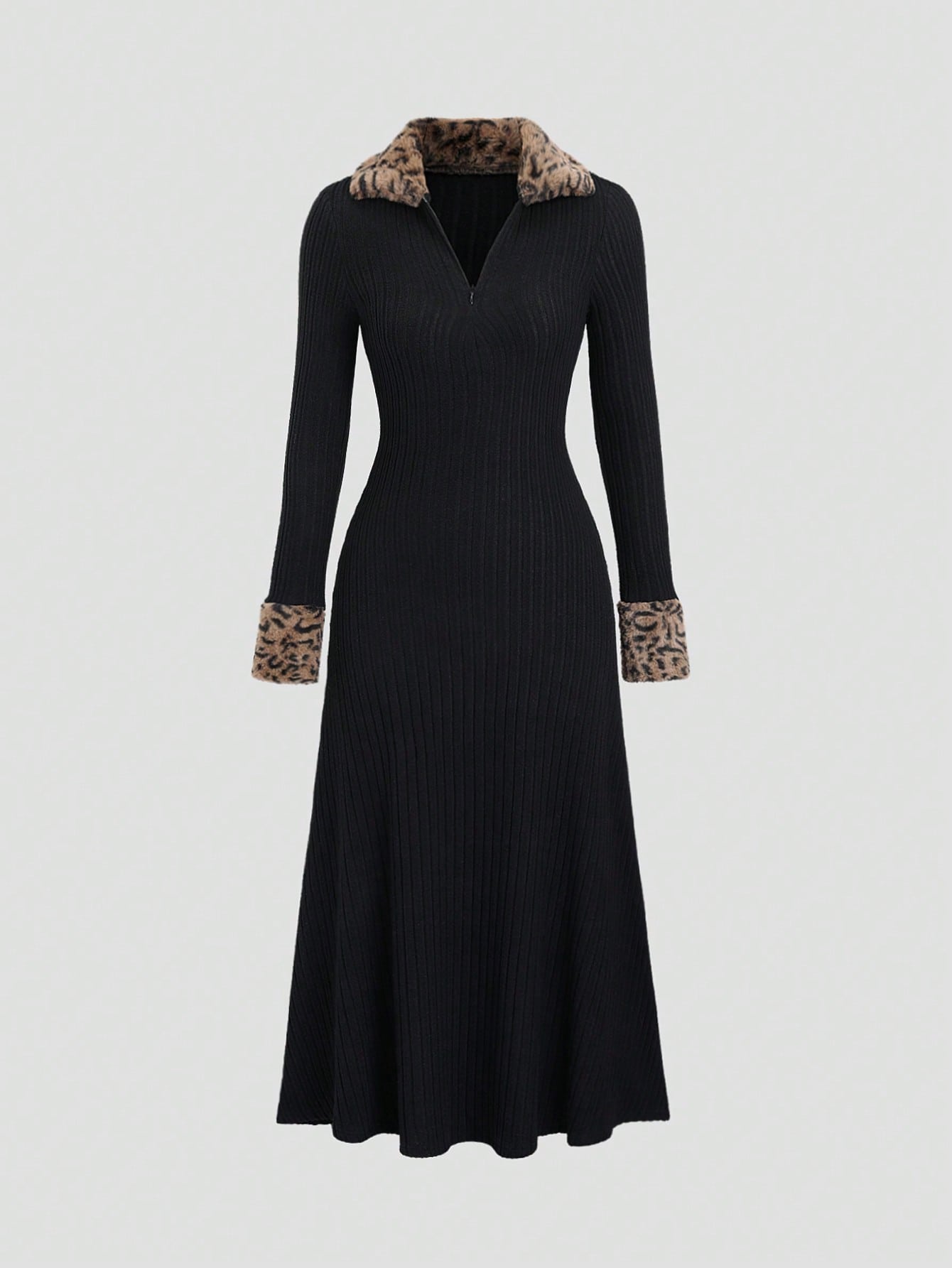 Sweetra فستان طويل للنساء، تصميم وصلات برقبة الأرنب المبطن بالفرو ذو طبعة جلد النمر، قميص كلاسيكي ضي